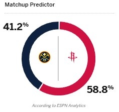 ESPN dự đoán tỷ lệ chiến thắng của trận đấu này sẽ lên tới 58,8% cho Rockets và 41,2% cho Nuggets.