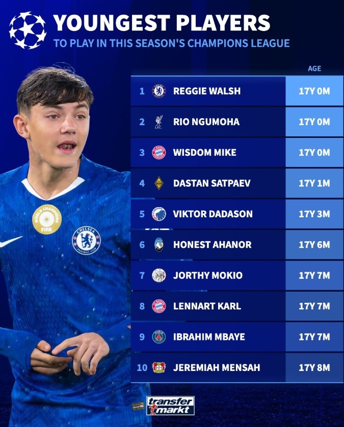 Sau đây là bảng xếp hạng các cầu thủ trẻ nhất ở các đội tham dự Champions League: