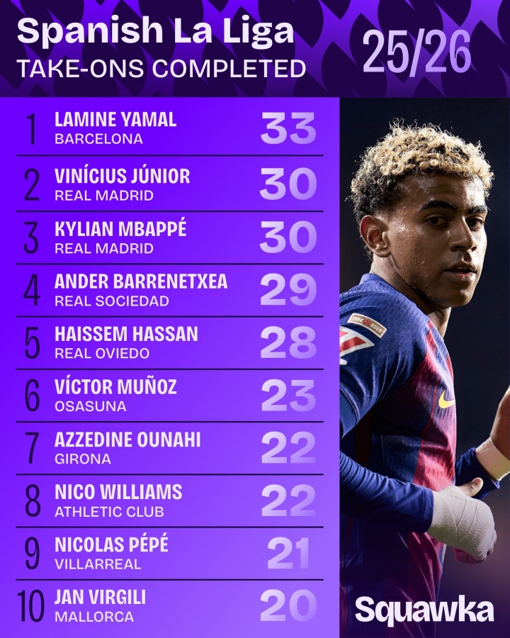 Barsay Amar, Kylian Mbappé và Vinicius của Real Madrid, họ đều có tài năng đột phá phi thường. Ở mùa giải La Liga 2025-26, theo thống kê của Squawka, Yamal đứng đầu về số lần rê bóng.