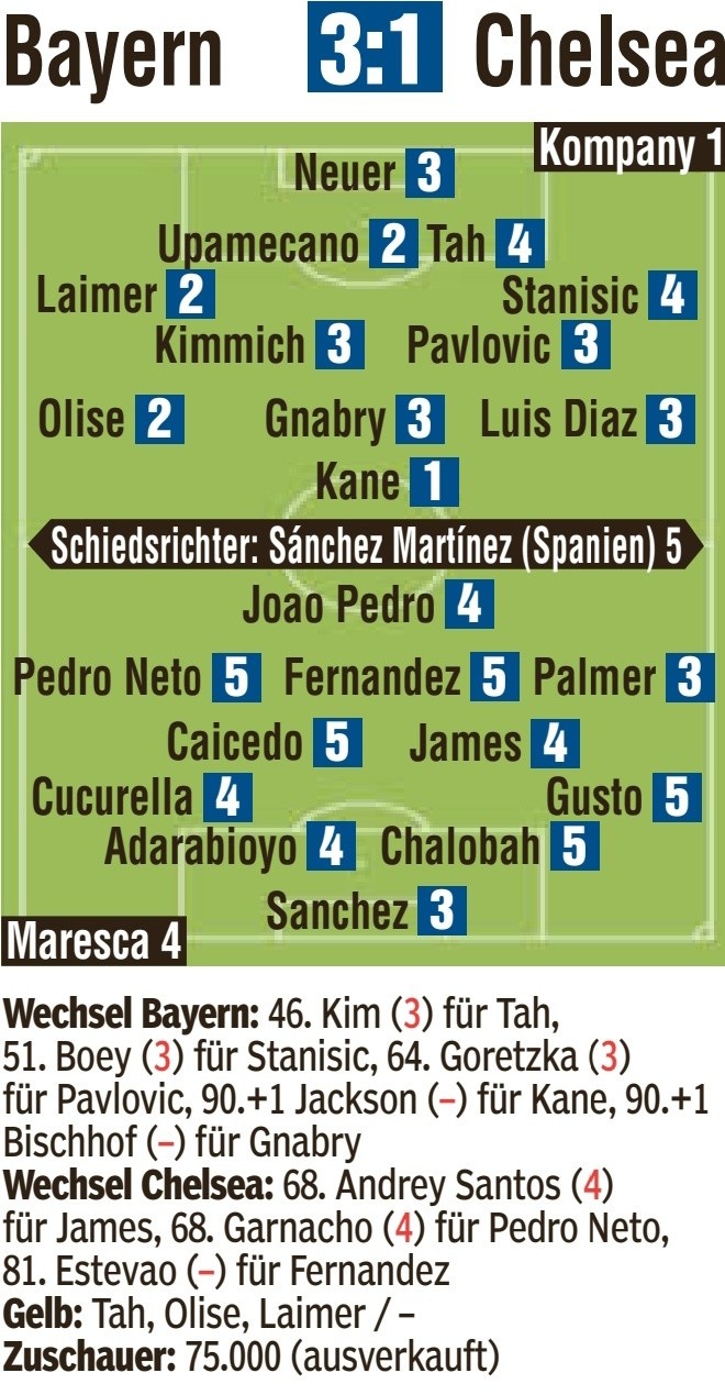 Bayern đánh bại Chelsea 3-1 trong trận đấu tập trung Champions League này. Bistro đã ghi bàn cho các cầu thủ của cả hai đội sau trận đấu, và Kane được trao tặng 1 điểm tốt nhất.